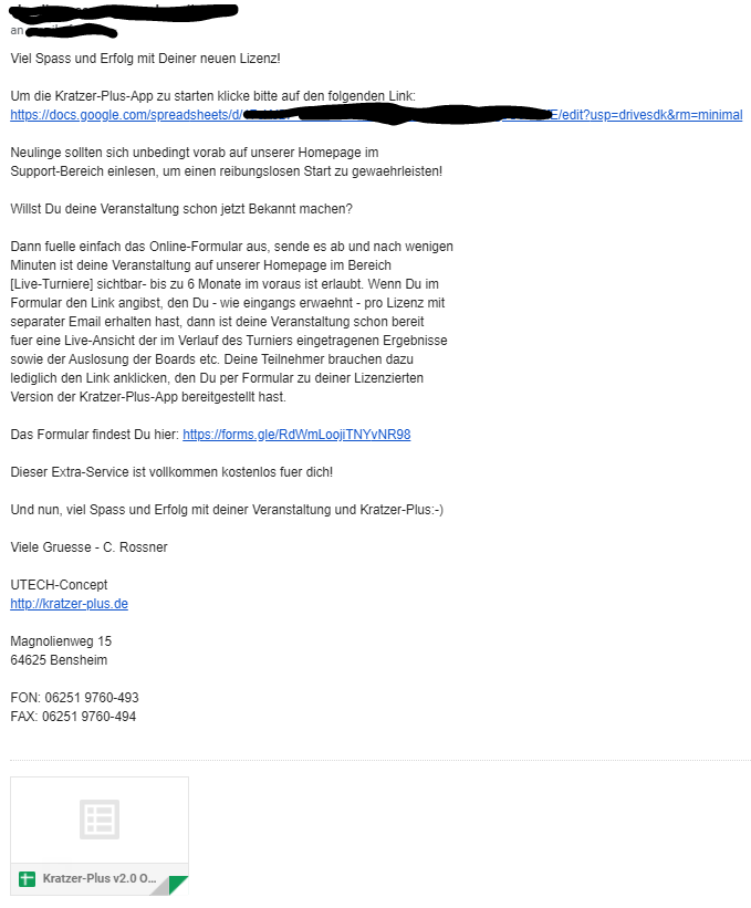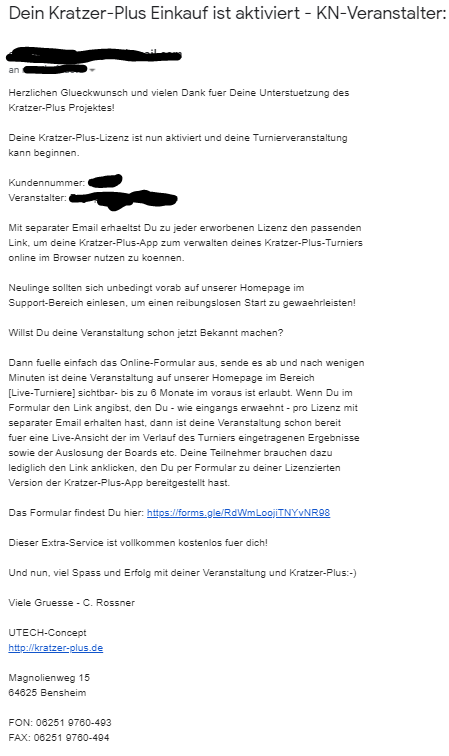 Nach Deinem Lizenzkauf, erhälst Du neben der Email vom Shop-System von unserem Lizenzierungssystem eine Email mit Deinen Lizenzdaten pro erworbener Lizenz und darin dem Link zur Kratzer-Plus-Turnierverwaltung passend zu Deiner Lizenz sowie eine Email pro Einkauf die mitteilt, das dein Lizenz-Einkauf aktiviert ist.